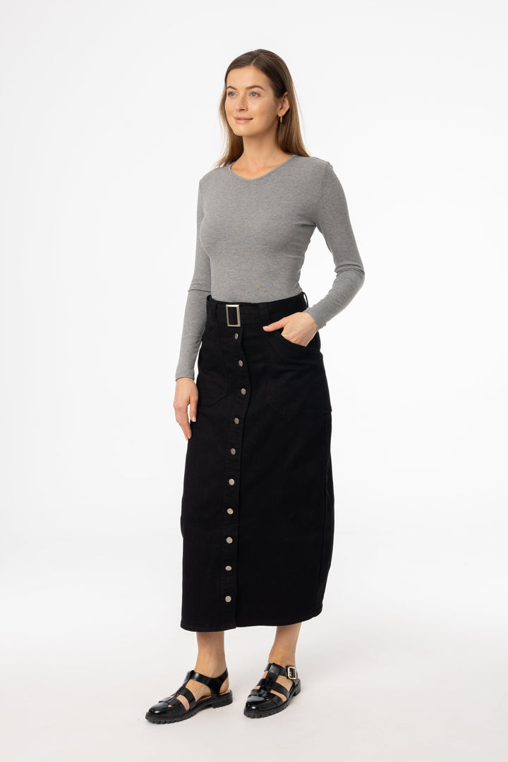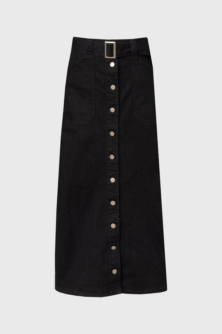 Black Belted Button Down Denim Skirt with Structured Waistband and Classic Straight Fit Design