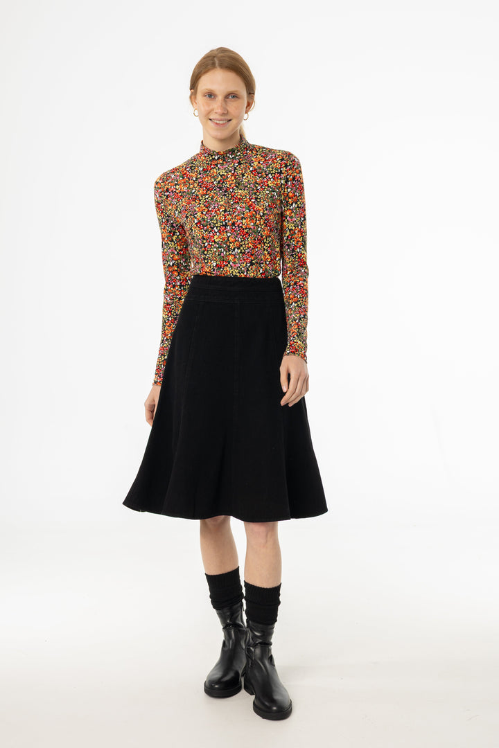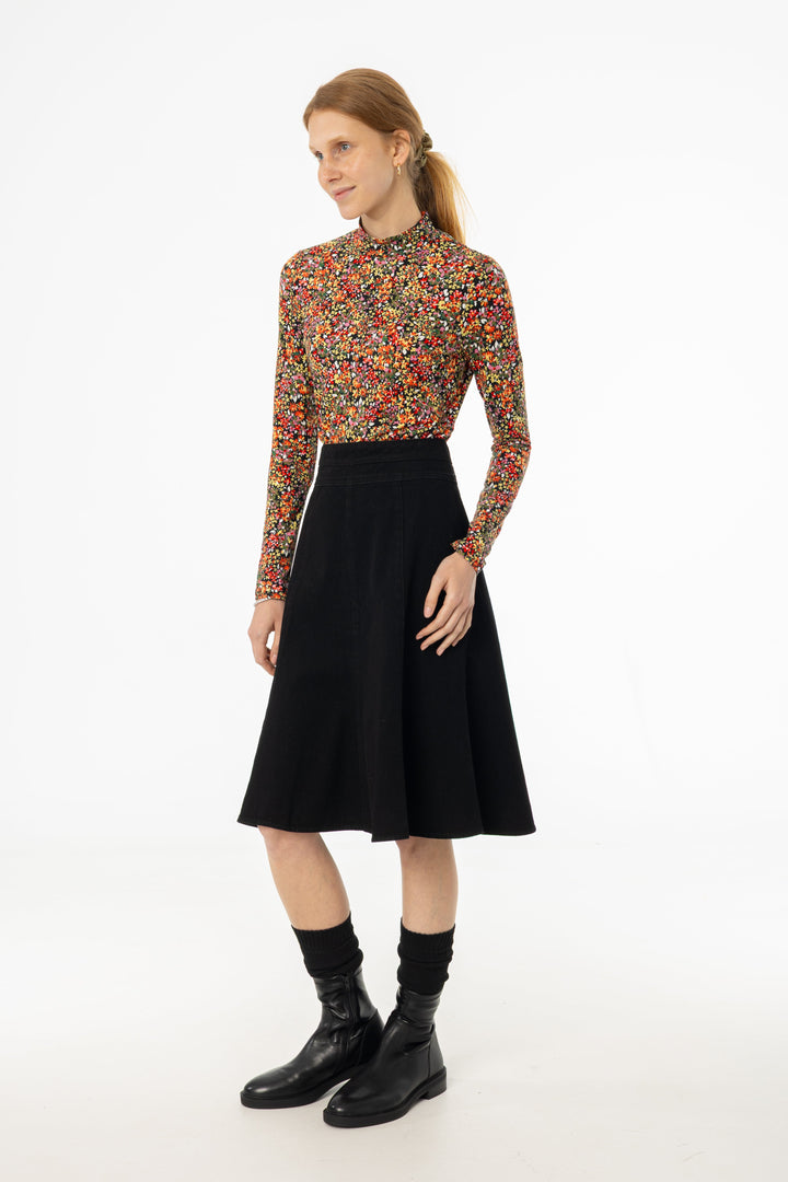 Soft flare creates gentle movement with every step. The knee length brings ease, making it an easy day-to-night choice. Pair it with a printed turtleneck or tucked-in sweater for cooler evenings.