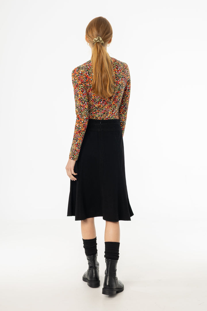 Black Flared Denim Midi Skirt with Classic High Waist Cut and Slight A-Line Design