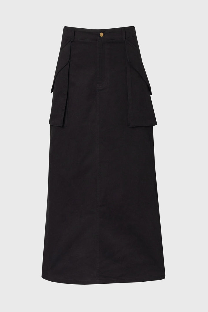 Black Pocket Cargo Midi Skirt with Straight Fit and Urban Street-Inspired Look