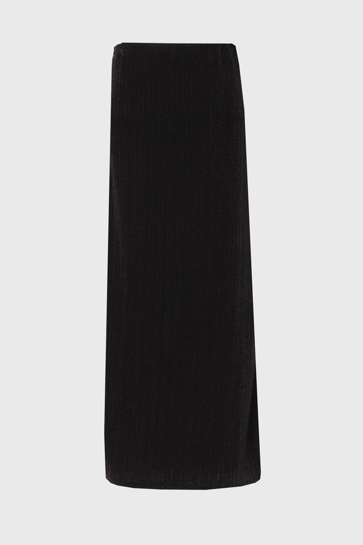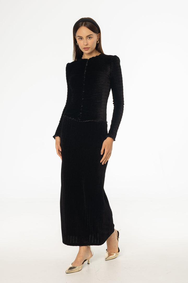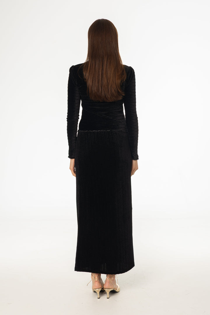 Black Ruched Velvet Skirt with Gathered Side Detailing and Elegant Slim Silhouette