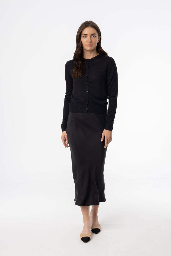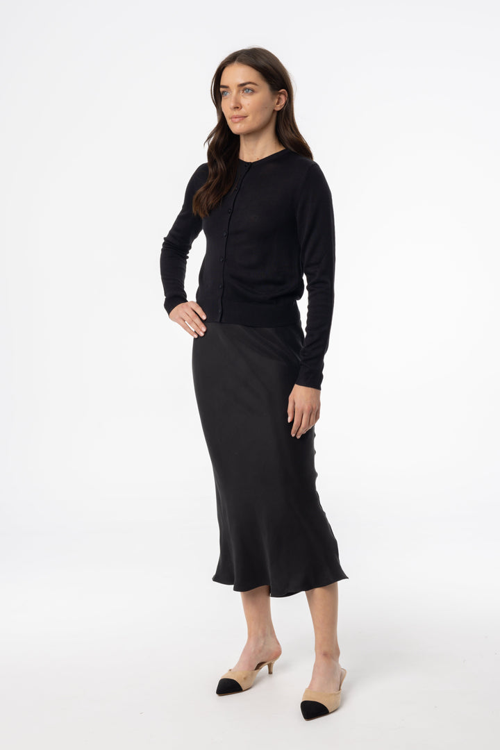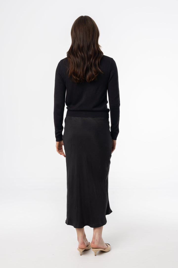 Black Satin Slip Midi Skirt with Elegant Glossy Finish and Minimalist Silhouette for Everyday Chic