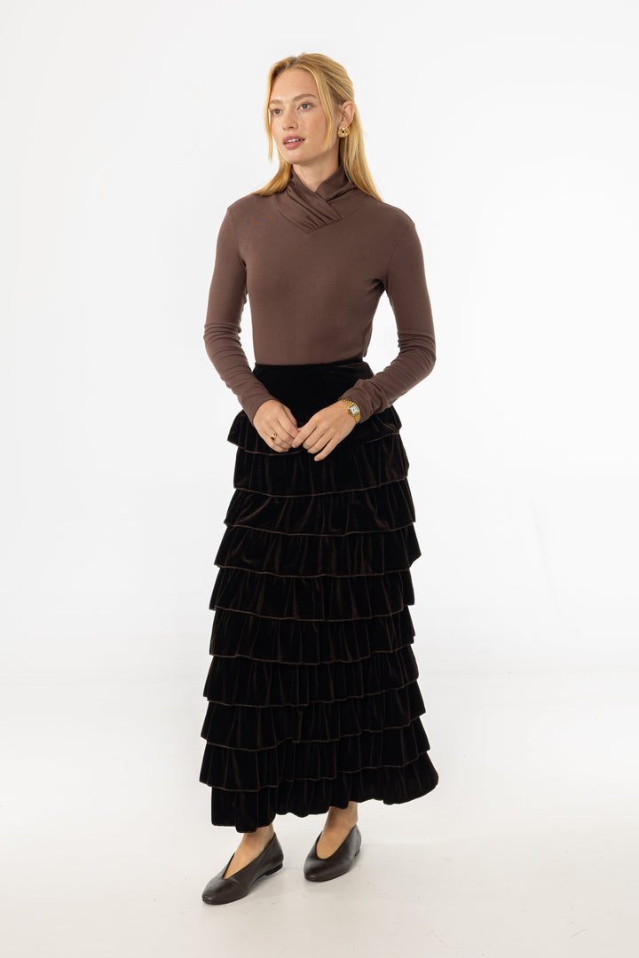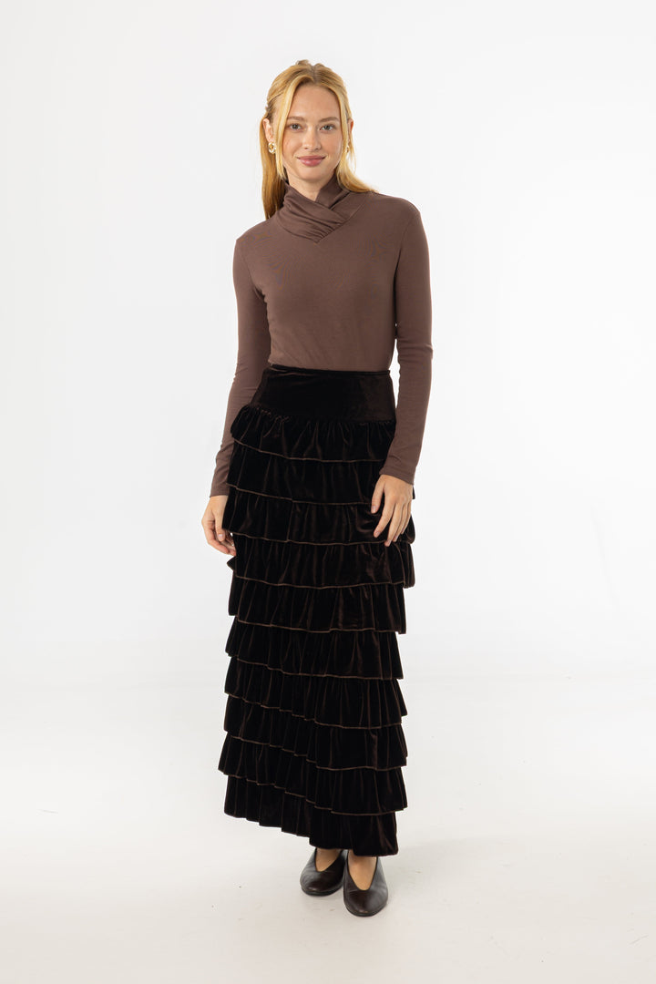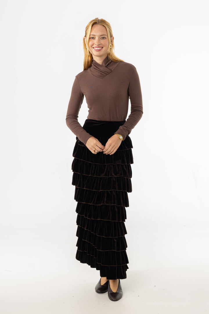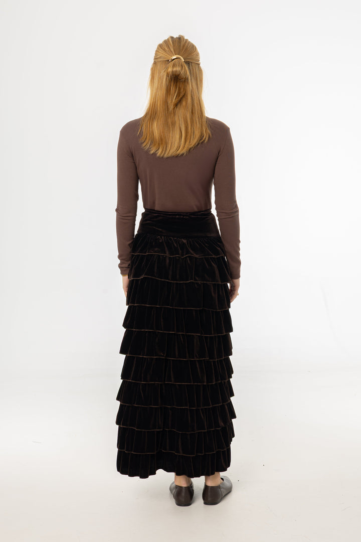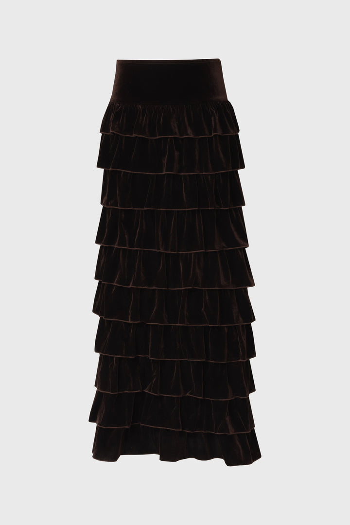 Brown Ruffle Velour Maxi Skirt with Smooth Fabric Texture and Romantic Layered Flow